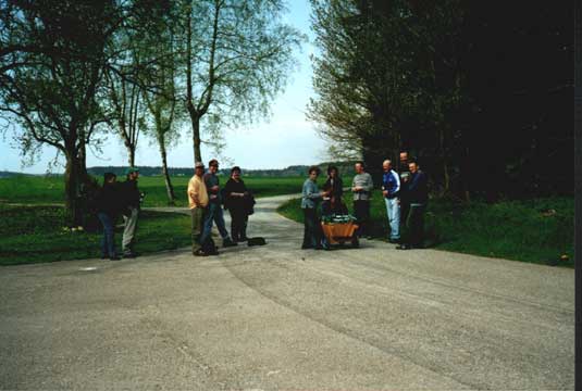 nach Liggersdorf. Zwischendurch wurde immer mal wieder eine kleine Rast gemacht, damit der Proviant weg kam und der Leiterwagen leichter wurde. Gegen 14:00 Uhr erreichte man das Festzelt und gönnte sich eine 3 stündige Mittagsrast, ehe man sich wieder auf den Rückweg nach Aach-Linz machte. Dort angekommen, endete nach einem "Abschlussbier" die diesjährige Maiwanderung. |