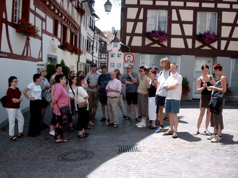 | Das 1. Orchester und deren Anhang und Freunde waren am 14. Juni in Meersburg. Dort angekommen ging es los mit einer Stadtführung durch die historische Altstadt. Unter anderem war auch das Weinbaumuseum zu sehen, wo gezeigt wurde wie in der Vergangenheit der Wein hergestellt wurde. Nach der Stadtführung gingen viele erst einmal zum Eisessen, dies war eine willkommene Abwechslung bei der Hitze. Darauf schloss sich dann die Kellerführung und Weinprobe an. Jene fand im so genannten "Alten Rathaus" statt. Hier konnten man sich von der Vielfalt der Meersburger Weine überzeugen und bekam noch eine Vielzahl von Informationen über den Wein und alles was so dazugehört. Der Ausklang fand dann im "Letzen Heller" bei einem gemeinsamen Abendessen statt. |
